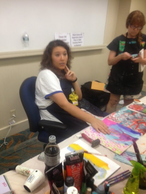 I got a bad start on the day. The other retreat I attended was from 10 to 5 and since my Planner Pad has been changed into an art journal I have no organization... Anyway, this retreat was from 9 to 4. No matter, as soon as I arrived (over an hour late, I would have been late even if it started at 10) Julie made me feel comfortable. I found a group of women willing to let me squeeze into their table and before I knew it I was happily stamping and playing with paint.