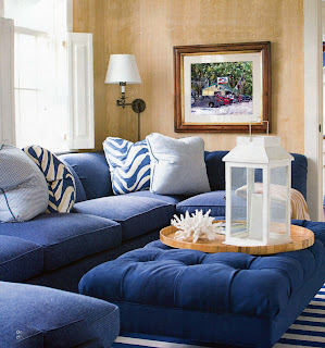 Whenever you have a blue and white living room, have a punch of natural tones like the faux-wood wallpaper from Nobilis. This nautical themed family room is both inviting and relaxing. The original artwork depicting the summer vacation scene is a wonderful reminder of times spent together as a family during the summer. Designed by Keller Donovan, this blue and white room is crisp simple and all-American. The designer's choice for artwork has been digitally replaced with the watercolor featured in this blog to give you decorating inspiration for your own home.