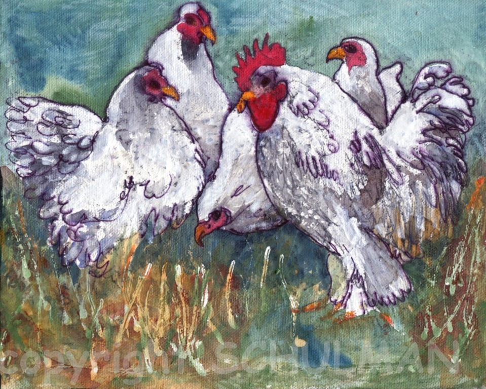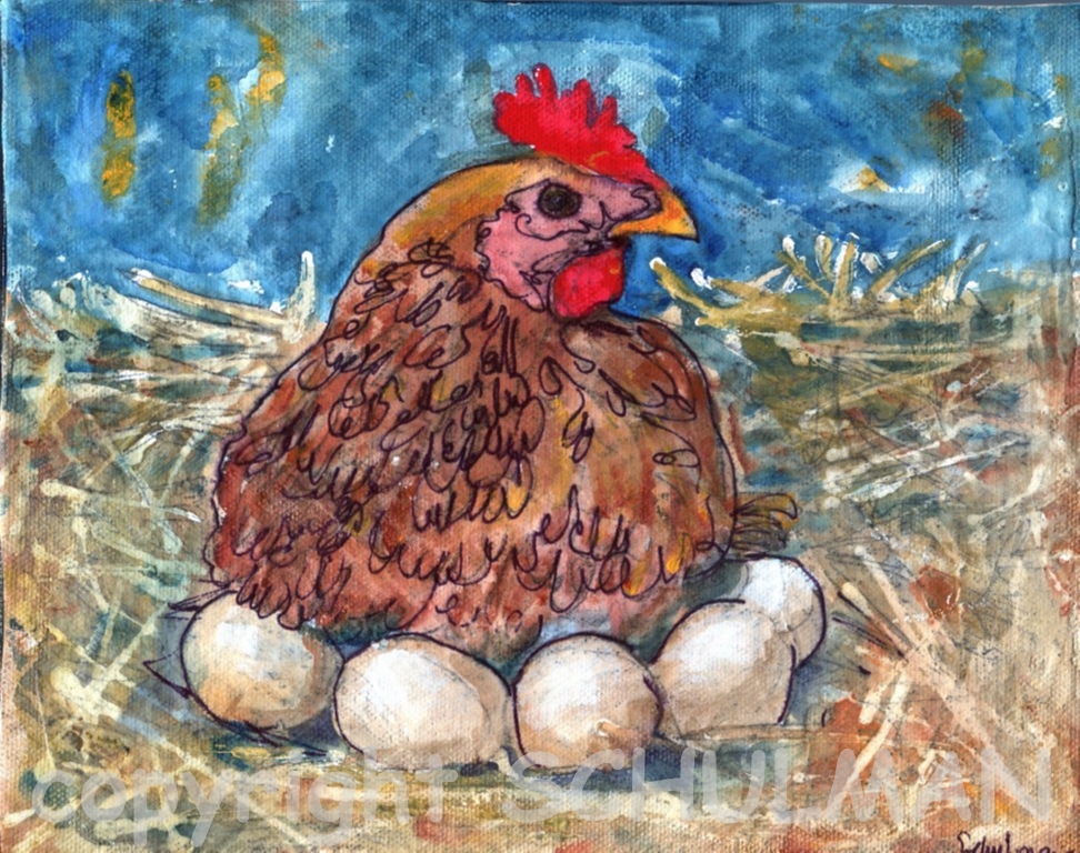 My latest series of original artworks features chicken paintings. Chickens and eggs are full of mystical and religious symbolism. I also enjoyed working with the aesthetic qualities of all the features both brown and white as well as the baby fuzzy yellow down.