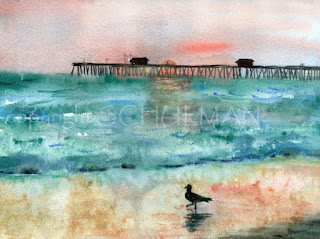The first beach watercolor painting pictures a red sun sinking into the turquoise watercolor of the ocean. A dock is silhouetted against an overcast coral sky. A lone sea gull walks along the sandy beach.