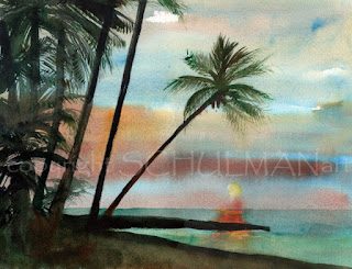 What is more romantic than a sunset with palm trees and the ocean? The next beach watercolor painting pictures a yellow sun sinking into the turquoise watercolor of the ocean. Palm trees are silhouetted against an overcast coral sky. They are both signed original landscape paintings by the artist Miriam Schulman.