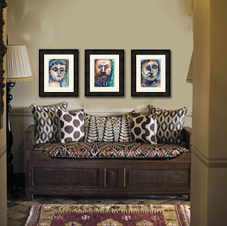 Ethnic home decor does not need to be all in browns and earth tones. Modern global decor can include happy tones of teal, pink, lime green and orange. In this bohemian decorating scheme three watercolors grace the wall above a sofa adorned with a variety of patterns and textures.