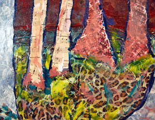 When painting abstractly, it can be sometimes harder to arrive at the right colors than when painting more realistically. When painting realistically, I derive my colors from the visual experience often exaggerating what I see with my moods to convey a feeling. In this painting of a mixed media tree landscape, I let the colors I saw in women's fall fashion inspire me. Using an unusual color palette of chartreuse green, a flesh toned rose pink, a deep classic burgundy red and a light dusky blue gray, I artfully combined these elements into a balanced painting. The hardest part of my painting can sometimes be coming up with an original name. This art is made of torn piano sheet music and I loved the way the colors harmonized together...so borrowing words from music I used "harmony" and then to create an alliteration-- I thought of the magical study of herbology. I mean where else would you find a pink forest but in the magical land?