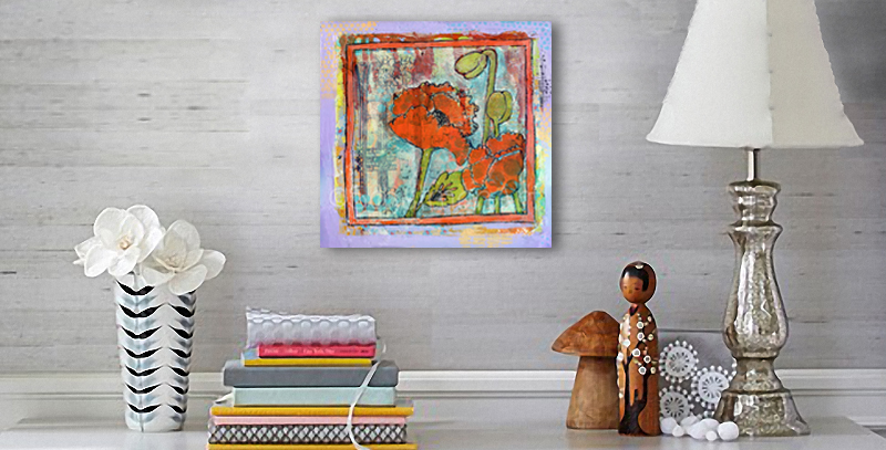 | For maximum productivity, I batch my art creation in painting sessions and my blog writing in writing sessions. This room features an orange poppy painting from the spring series, "Spring's Trumpet" |