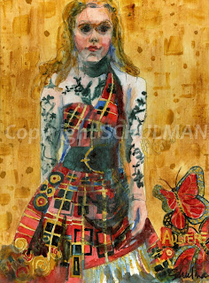 | Illustration by Miriam Schulman of Butterfly hat created by eccentric milliner Philip Treacy and conceived by McQueen. Original in a private collection. Prints available from schulmanart.imagekind.com |