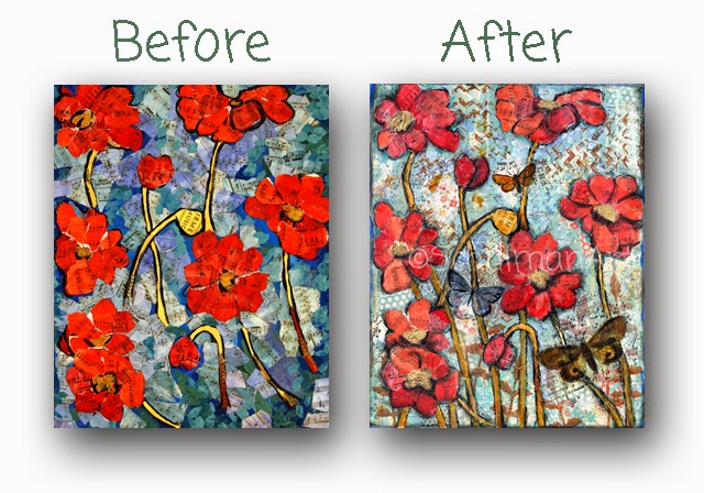 Which do you like better? The art before or after? The "before" art can no longer be collected as an original artwork, but prints are available of this art on imagekind. The art on the left is called Poppy Hoppy The art on the right feels like a completely different artwork, so deserved it's own name, just like we don't call butterflies "caterpillars". The art on the right is Butterfly Brahms. 16x20" original mixed media collage art |