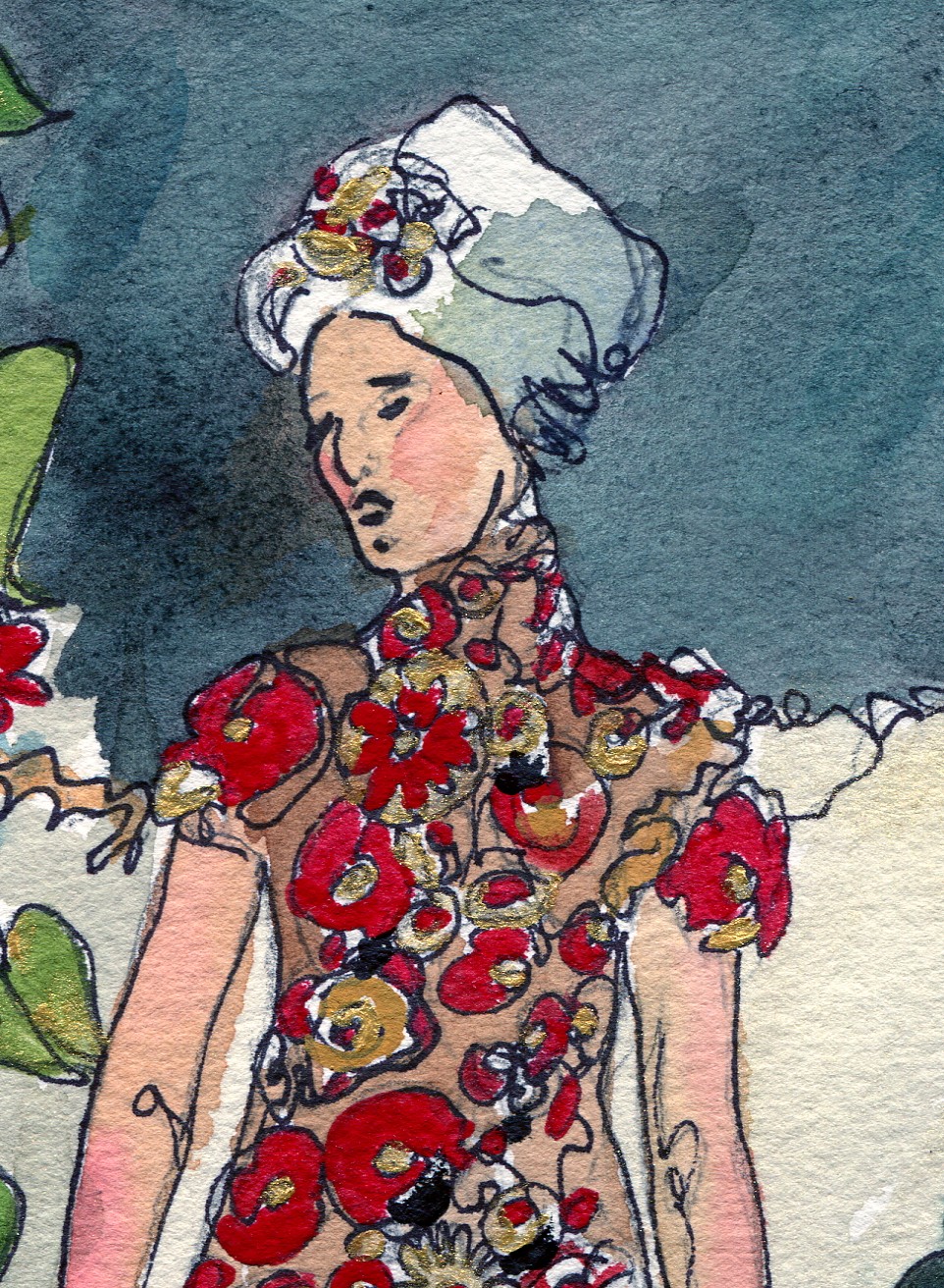 The watercolor illustration is derived from the runway show Voss which featured a turbaned woman in a ornately embroidered red dress. (actual dress to the left) This dress was on display in the Savage Beauty exhibition during the summer of 2011 at the Metropolitan Museum of Art in New York. The dress on the model in the runway show had a hem of black feathers. in another show. This fashion design reminded me of two of Gustav Klimt paintings, Garden Path with Chickens and also The Girlfriends. The dominant colors in this fashion painting are red, green and gold. There is also metallic gold acrylic details in addition to the luminous transparent watercolors.