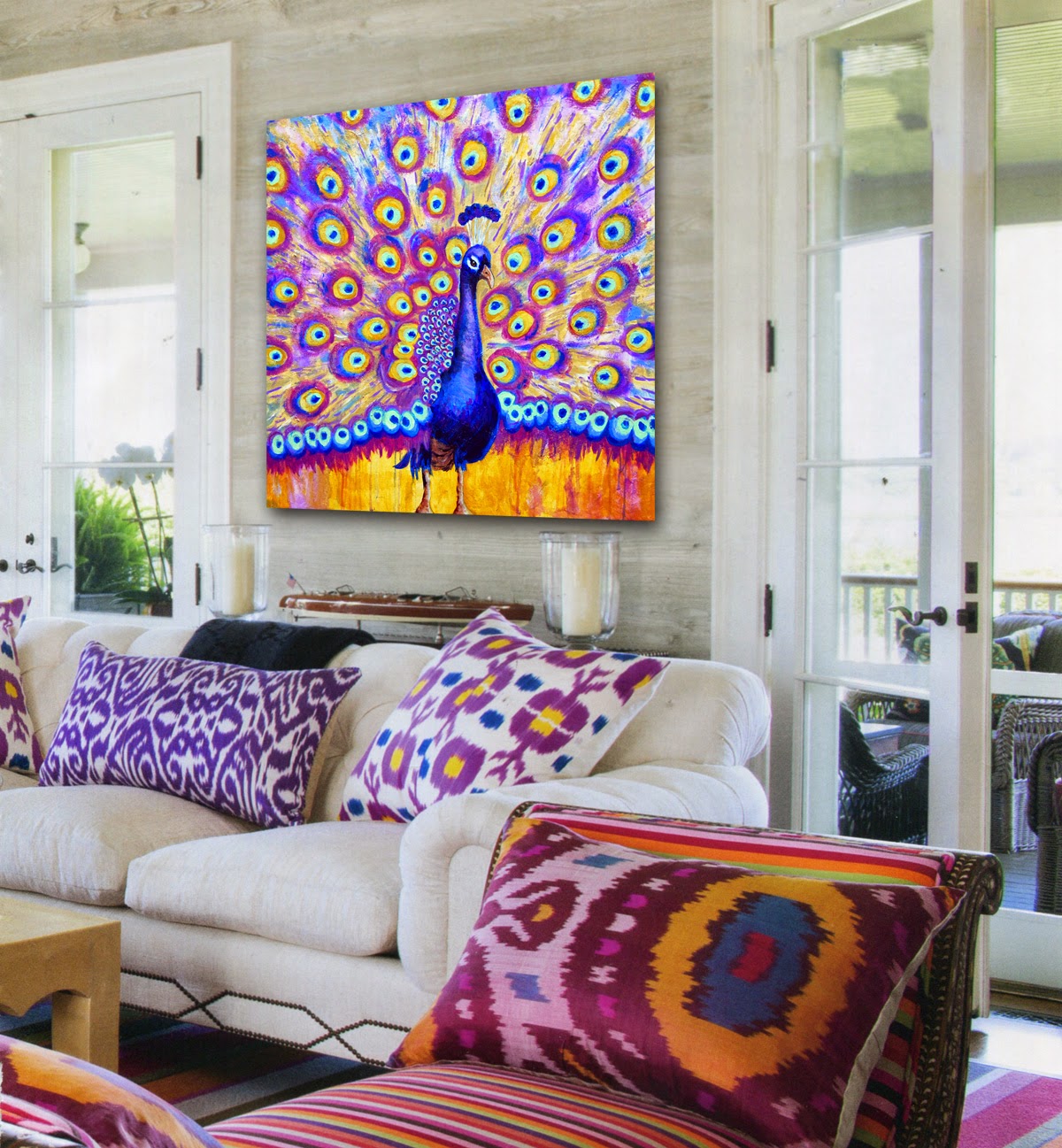 This living room packs a powerful visual punch, but really starts with a white or beige couch white walls and plain furnishings. You can get this look too just by adding peacock art, ikat pillows and a bright floor rug! |