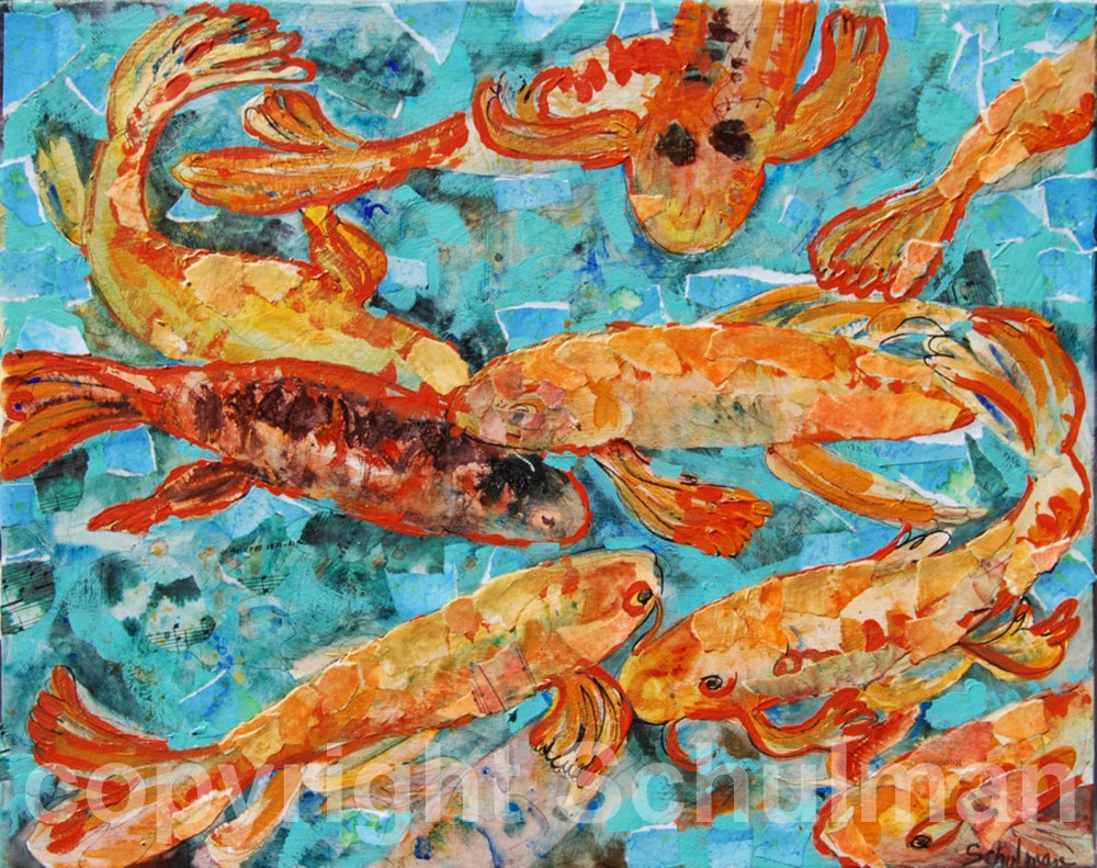 The painting depicts tangerine orange and gold koi fish swimming in a cockatoo turquoise blue pond. The art has been given a coat of protective acrylic varnish. There are mixed media collage elements of art papers, tinted piano sheet music and watercolor paper as well as acrylic paint, There is also subtle iridescent gold...