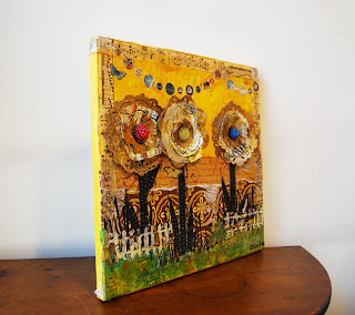 This original collage painting is bright warm yellow, and brown with touches of chartreuse green. The art pictures a 3-D textured flowers with jeweled centers. The mixed media collage was created with pens, stamps, inks, art papers, passion, love and more. The border of the art...