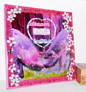 Two pink pigs go nose to nose with their piggy love. A great inspiring piece that reads dream, love, believe and has the peace symbol. This is an original signed one of a kind artwork, executed using mixed media collage techniques.