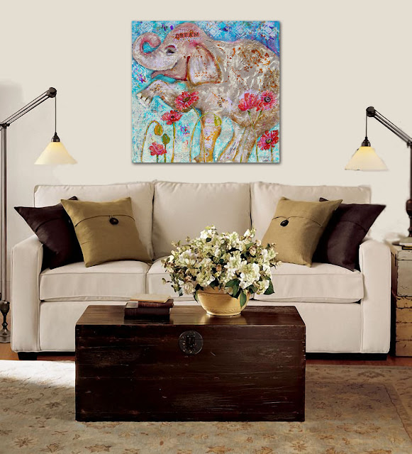 One more Decorating idea: If you are not inspired by Feng Shui, look how great the Elephant painting looks above this Pottery Barn sofa. Can you imagine it in your home?  >>bring this painting home