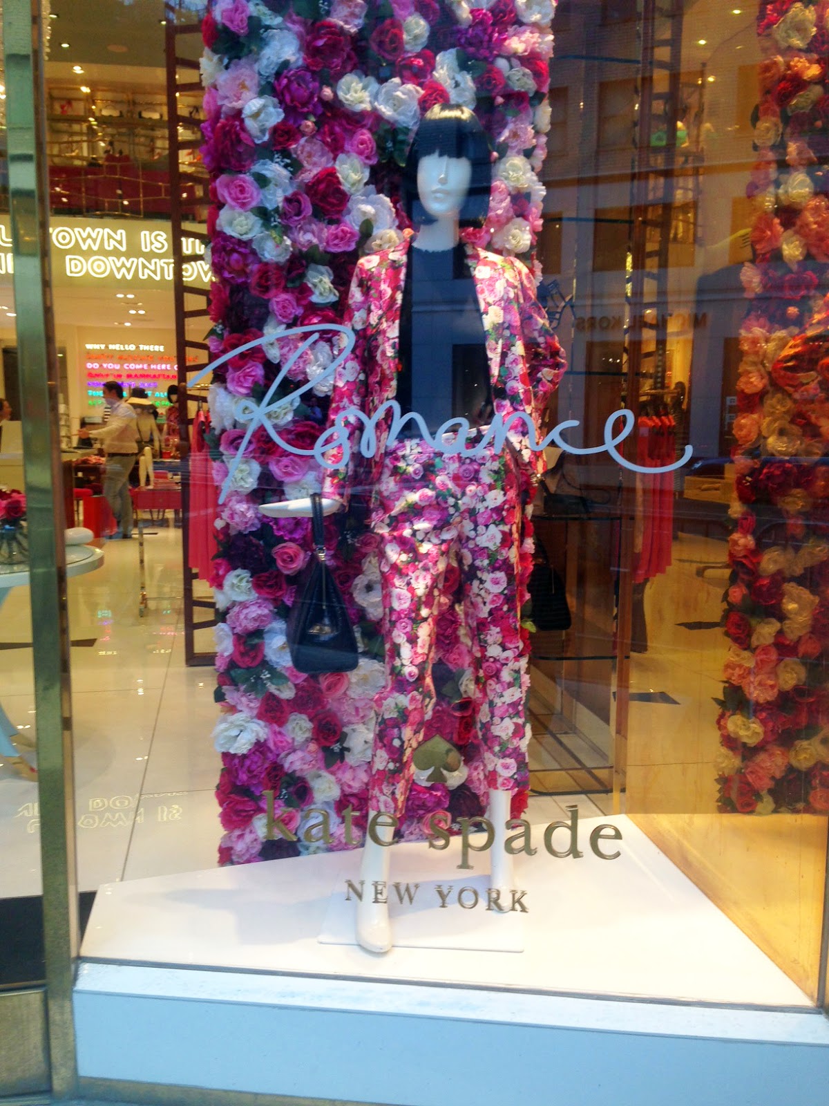 Floral prints are a big trend this summer as well. You see the same roses as in the florist shop in the Kate Spade pants. I love the way the word "romance" is positioned just at the waistline of the manikin so it acts as a belt. Everything from the floral backdrop, the decals, the manikin all work together to form a harmonious composition. |