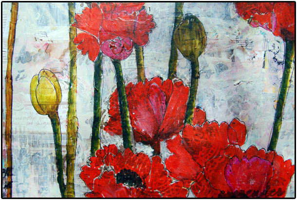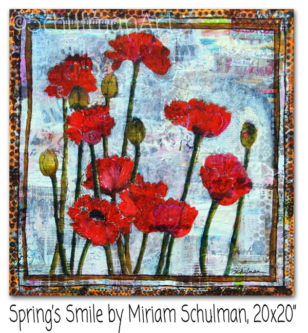 In order to make the poppies "pop", I white washed the background with diluted white acrylic paint. The paint was diluted with glazing medium. not water. You can still see the layers peeking through the white veil but they no longer compete with the flowers. I teach all these techniques on my free youtube channel SchulmanArt plus I also offer online classes at theInspirationPlace.net Mixed Media Madness is probably the best class to learn most of these techniques. If registration is not open now, then you can get on the waitlist here. |