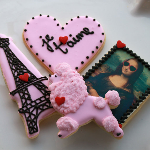 These cookies have that certain je ne sais quoi, don't you think? Tell your lover that you have the hots for them in French and they will be yours FOREVER. These cookies are also great to send to grandchildren far away-- to your child in college or just to order to have in your own home to keep a light hearted holiday spirit. This shop will handwrite your note on a pretty little card so the recipient knows who sent them such an awesome gift. Each cookie set includes one Eiffel Tower cookie, one pink poodle cookie, one giant heart cookie and one Mona Lisa wearing heart goggles.