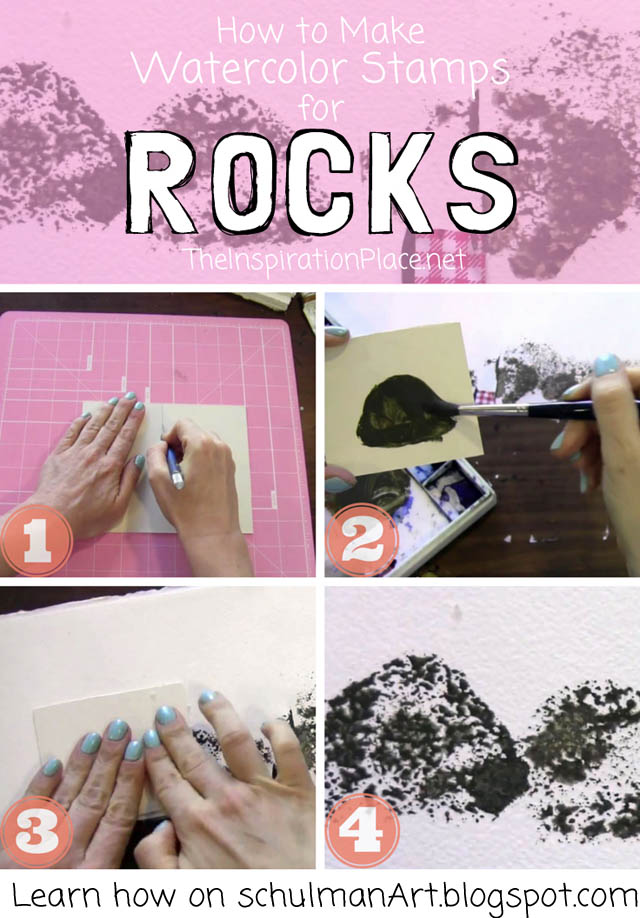 4) The result is going to depend on the "gushiness" of your paint layer. If you don't use a lot of paint, then you will get a drier texture as shown above. You can leave it as is to make it look like snow on rocks or light on rocks or you can put a glaze on top but still maintain that pebbly texture. If you use a paint color that is more greenish then, the stamp will make it look like a mossy rock. If you use a lot of paint, then your stamp will leave "veins" which is also quite a nice texture effect which mimics the appearance of lichen.