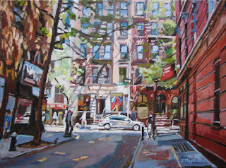 When I attended FSU my professors were mainly abstract painters and I felt compelled to go large and abstract. I yearned for my roots and created some massive “graffiti wall” canvases that incorporated city imagery. In the years since I have returned to my perceptual roots. Out of necessity I work smaller now and base my work from what inspires me in my little universe. That would include lots of city images with a focus on everyday people in the street. My daughter lived in Fort Greene whiling attending Pratt. I have enjoyed returning to Brooklyn where I was born and painting the neighborhoods of that borough. A week ago a California woman bought one of my Park Slope prints and asked me if it was 4th Street I painted. I knew it was because my brother lives on that street and it turned out I had painted the front of this lady's brownstone! The next week I got an order for the same print from her old neighbor!