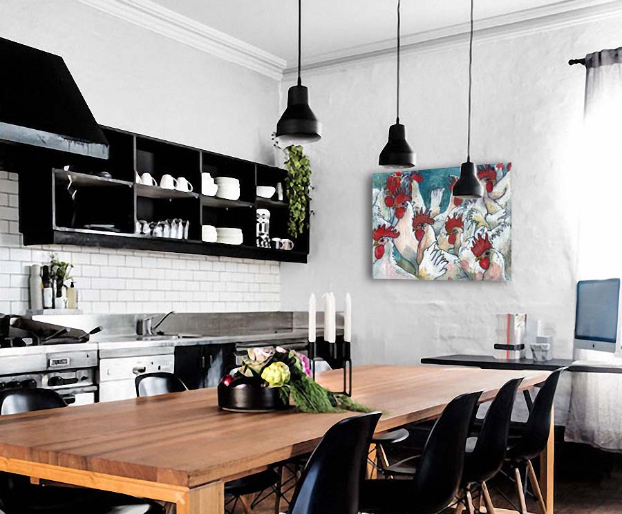 A little bit of Rock and RollA country kitchen doesn't need to be all wood and white. Look how cool these black cabinets look. Have you noticed that black cabinets are all the rage for kitchens now? Custom order the rooster art on canvas for a chic look that can go modern. (another hint: you can paint old cabinets black for a fast, affordable makeover) |